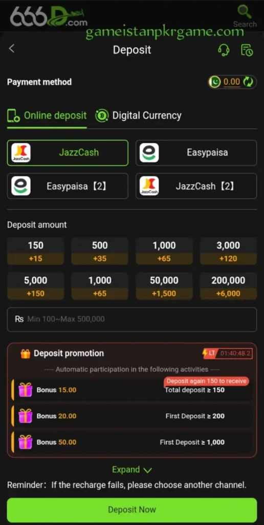 - Deposit Options: JazzCash, Easypaisa, and local bank transfer.